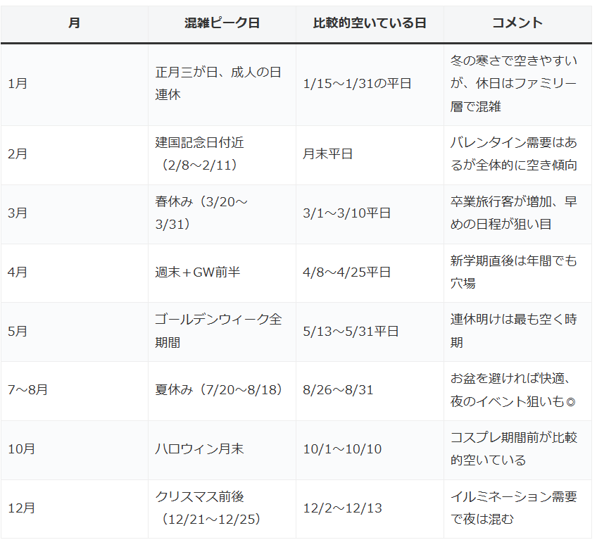 「混雑しやすい日」と「狙い目の空いている日」を月ごとにわかりやすく紹介します。